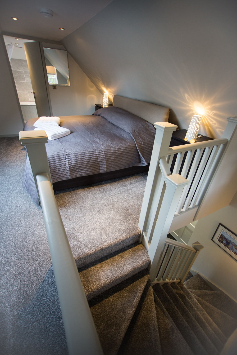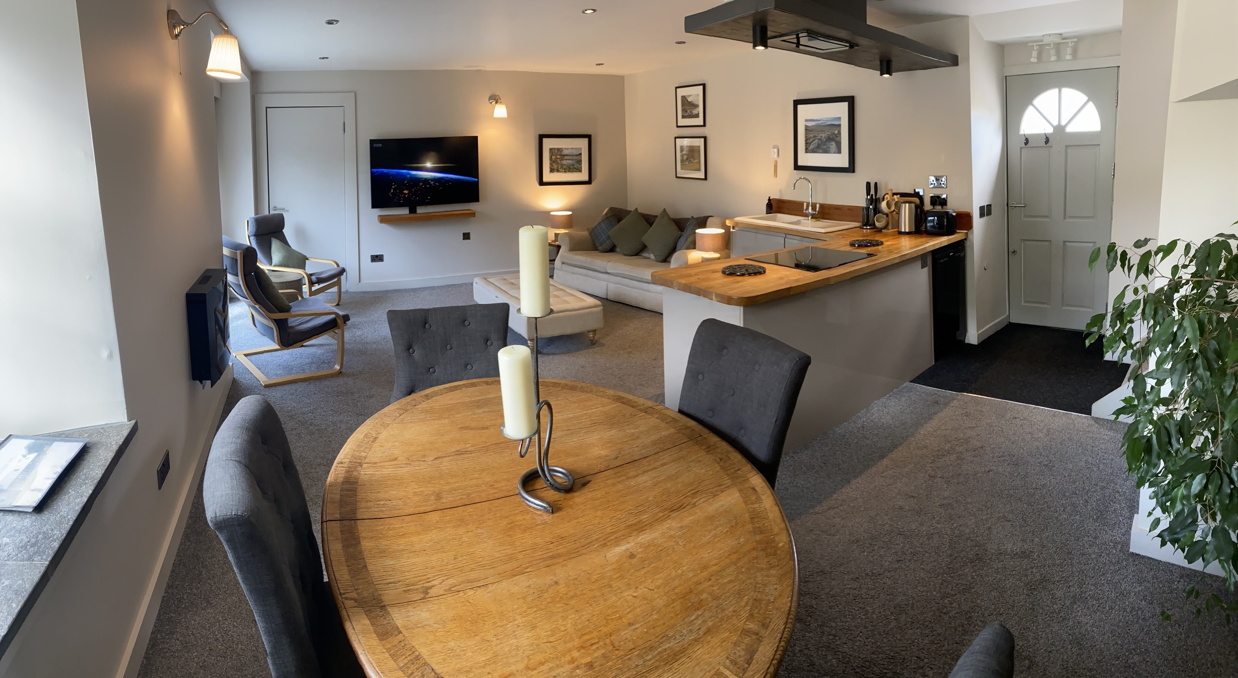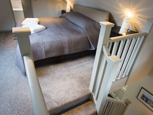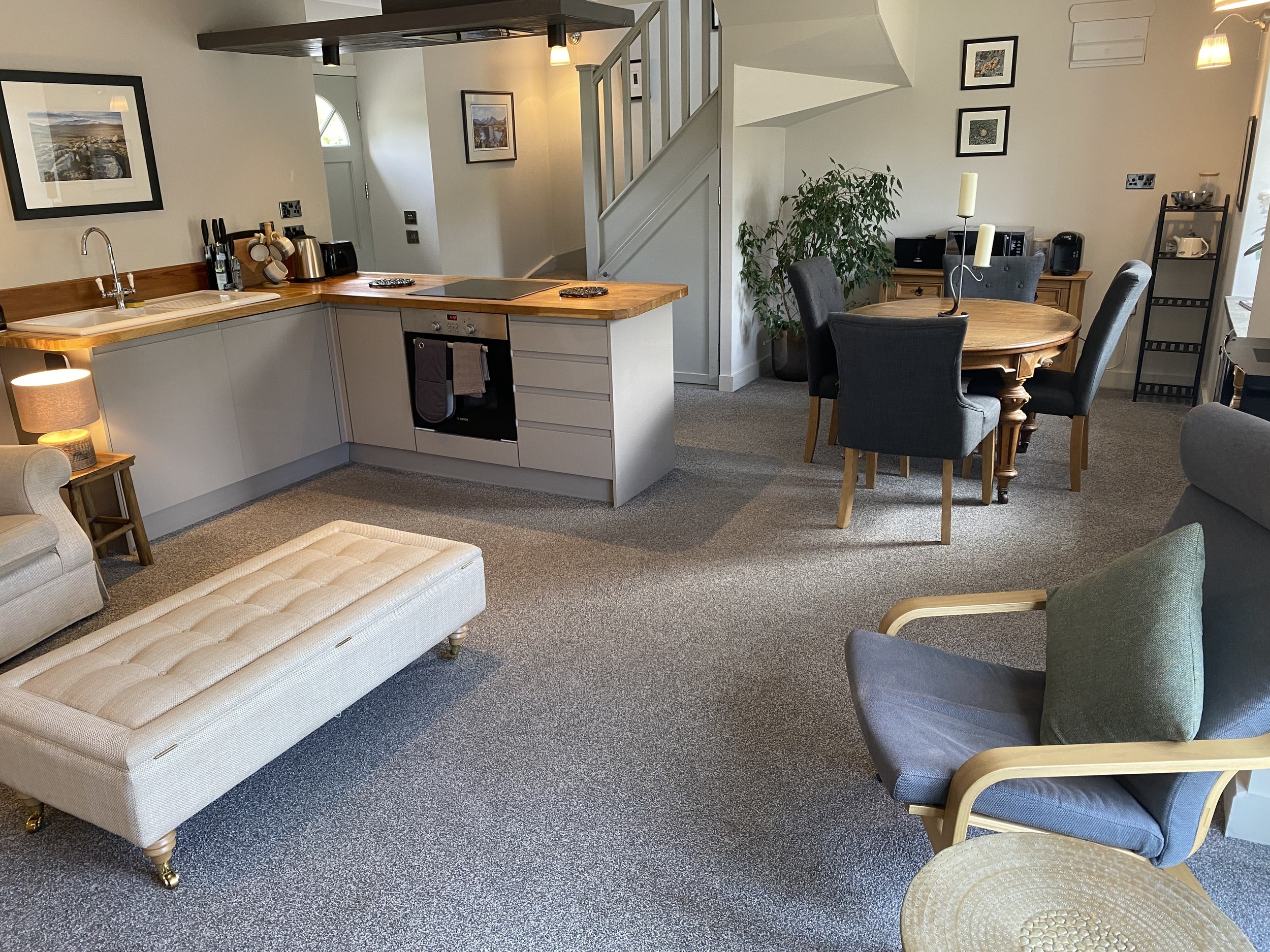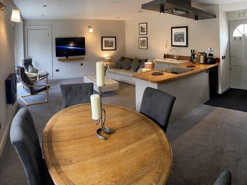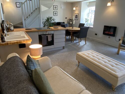 It is a warm spacious apartment within a detached steading building. It comprises a relaxed open living space with kitchen, dining and lounge areas downstairs and a bedroom with ensuite bathroom upstairs.